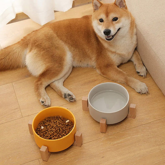 Elegant matskål i keramik med guldkant och stabilt träunderrede