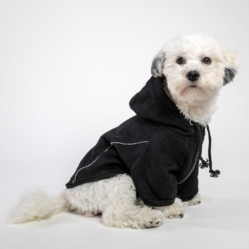 Cool hoodie for dogs with a small zipper at the front. Nicely warm with fleece lining. Nice details with contrasting stitching. Has two covered legs for the front legs.